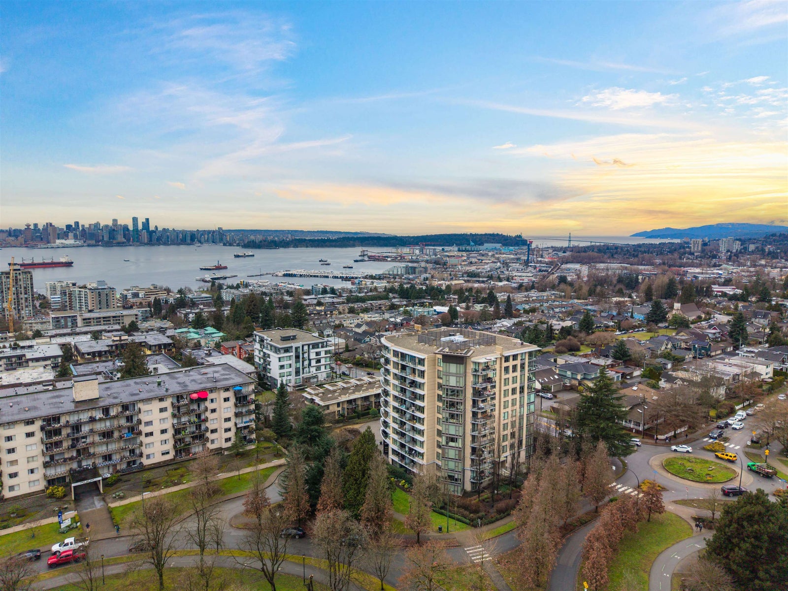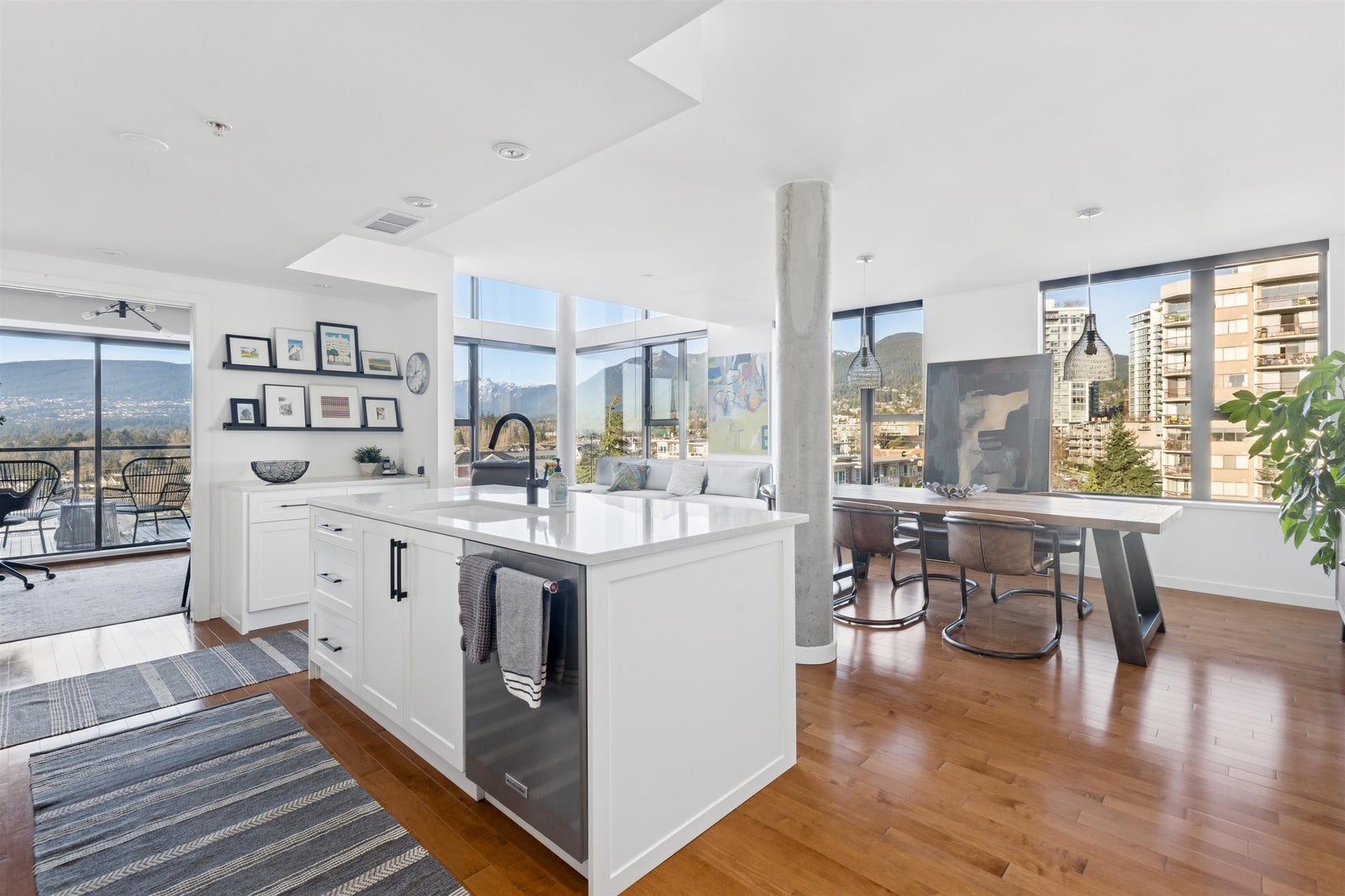 A rare 2,200 sf corner penthouse with stunning panoramic views in every direction. This two-level residence features dramatic double-height windows, renovated interiors & sweeping outlooks of the North Shore Mountains, Victoria Park, the city skyline & incredible sunsets. The main level offers a modern chef’s kitchen with premium appliances & an oversized island, spacious living & dining areas, 200 sf of outdoor terraces & an additional primary bedroom. The upper level features a second primary suite with a spa-inspired ensuite & California closets, plus an additional bedroom, full bath & a sleek media lounge. With expansive corner exposure across two floors, natural light & vistas are unmatched. Perfectly located in the heart of Lower Lonsdale—walk to the SeaBus or Whole Foods in minutes.